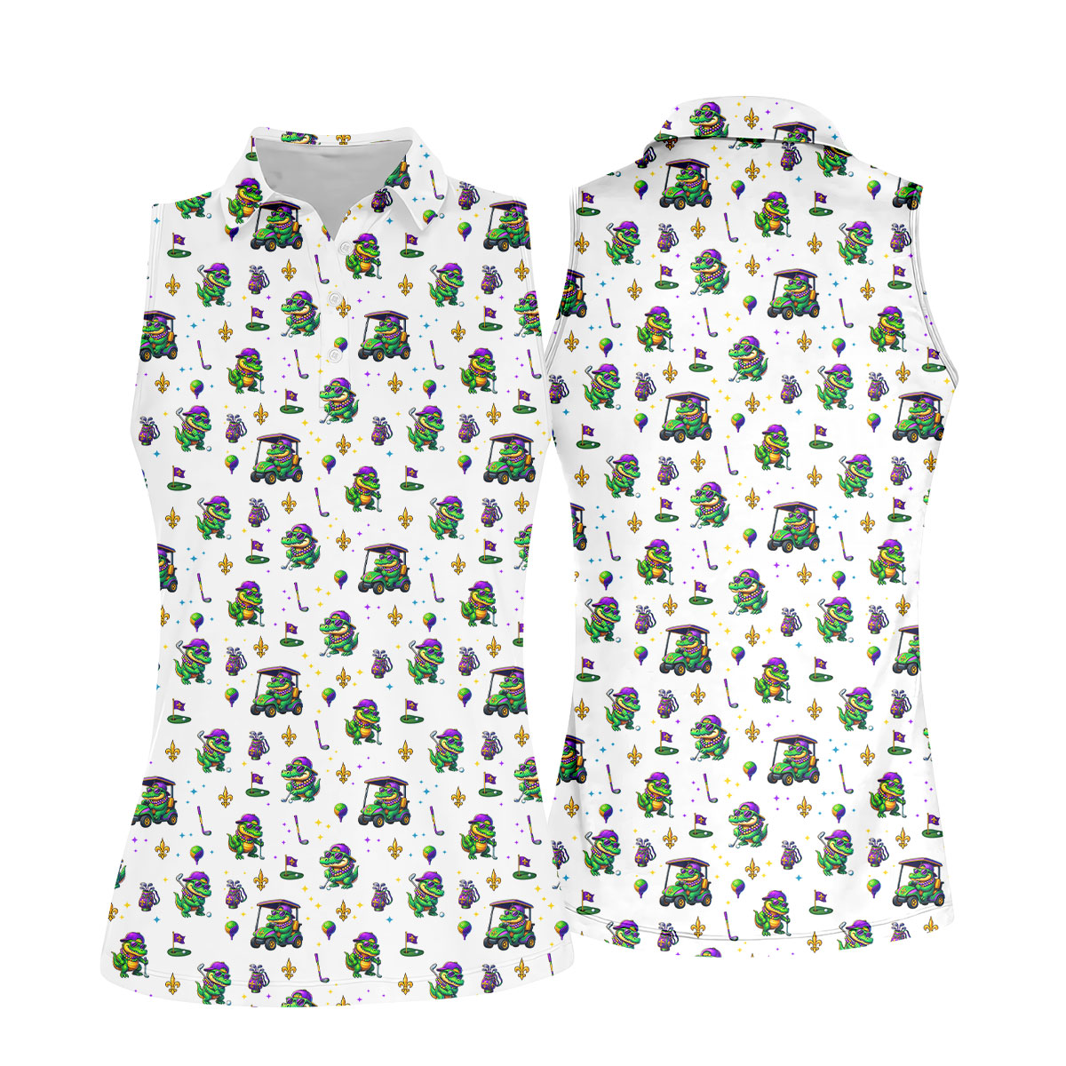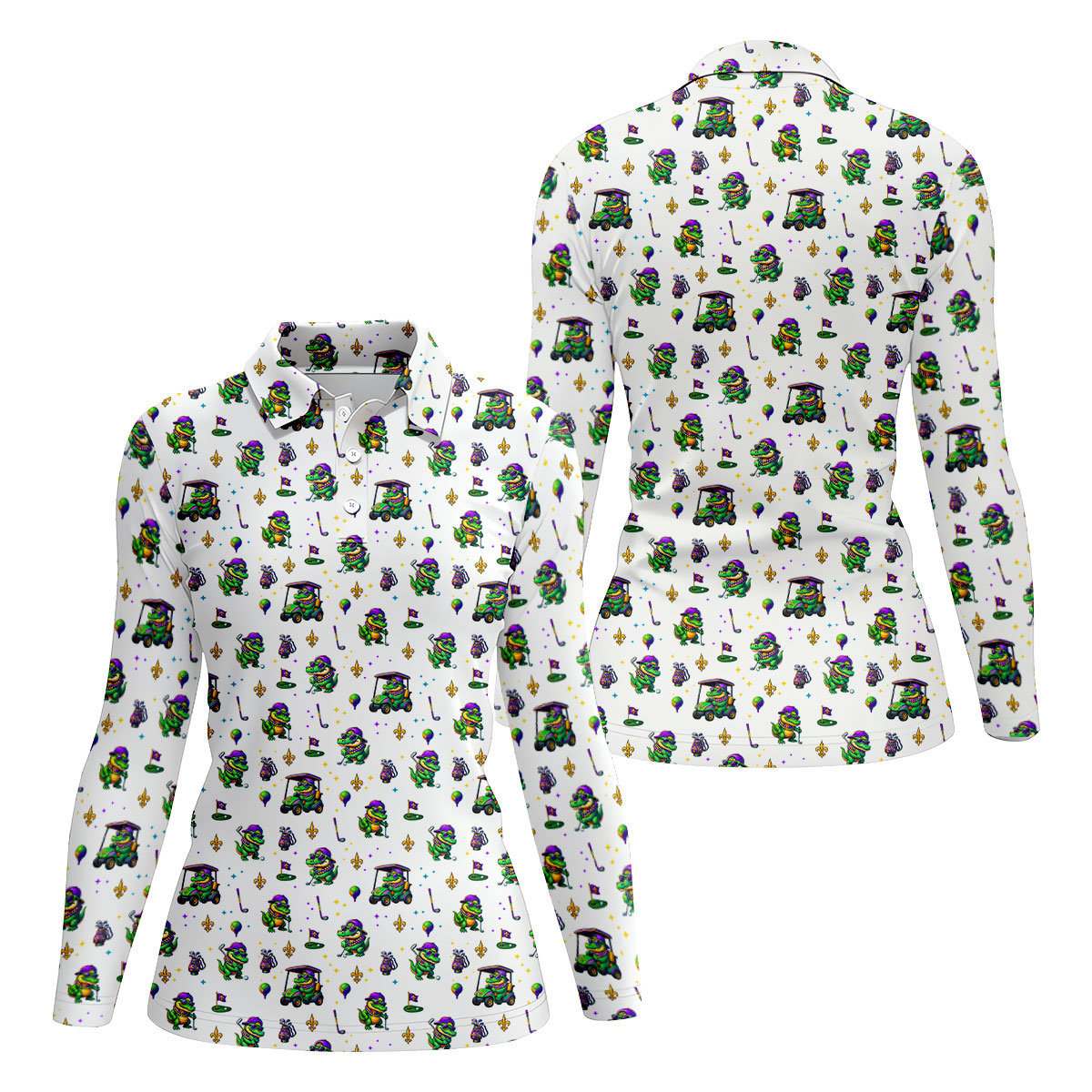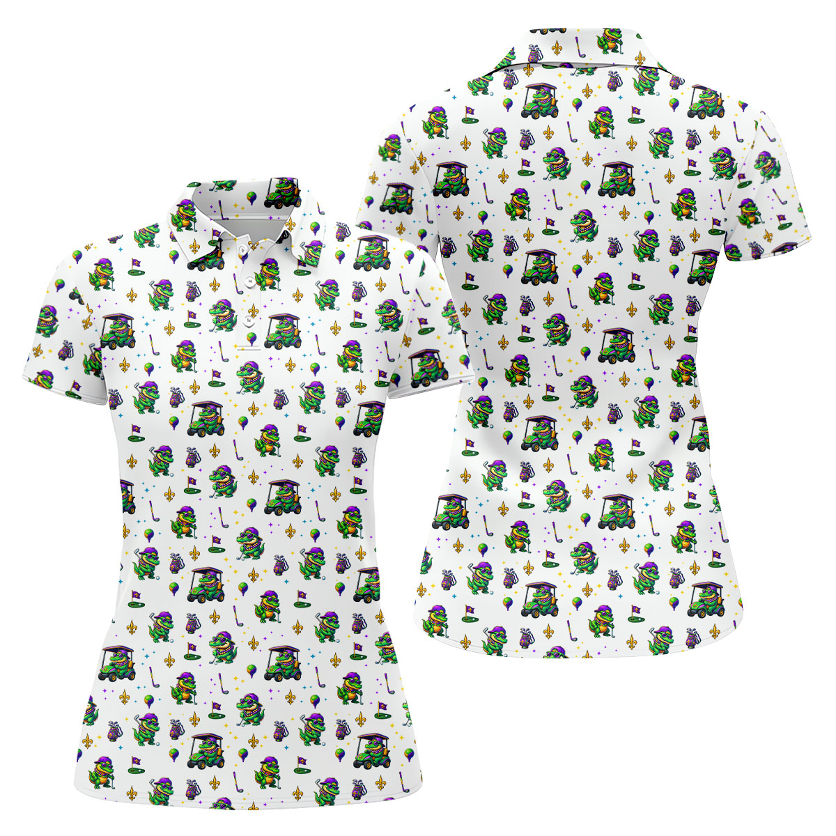 Funny Crocodile Mardi Gras Golf Shirts, White Golf Shirt, Festive Women Golf Top, Ladies Golf Shirts