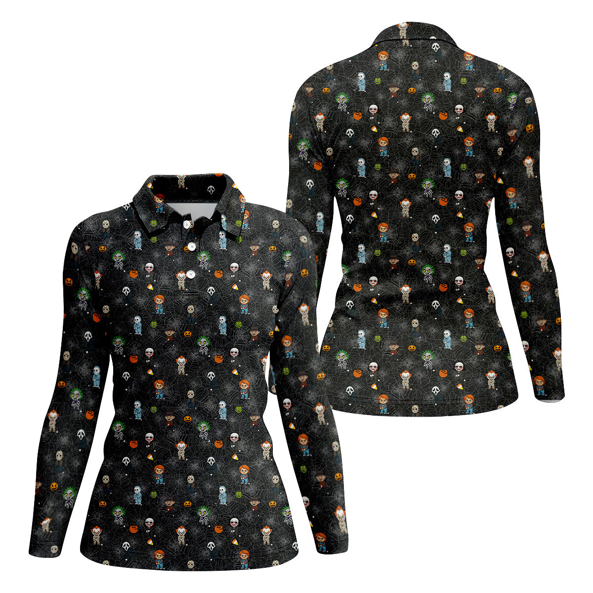 Funny Horror Character Black Golf Polo Shirt, Horror Movie Shirt, Halloween Golf Shirt, Womens Golf Polo
