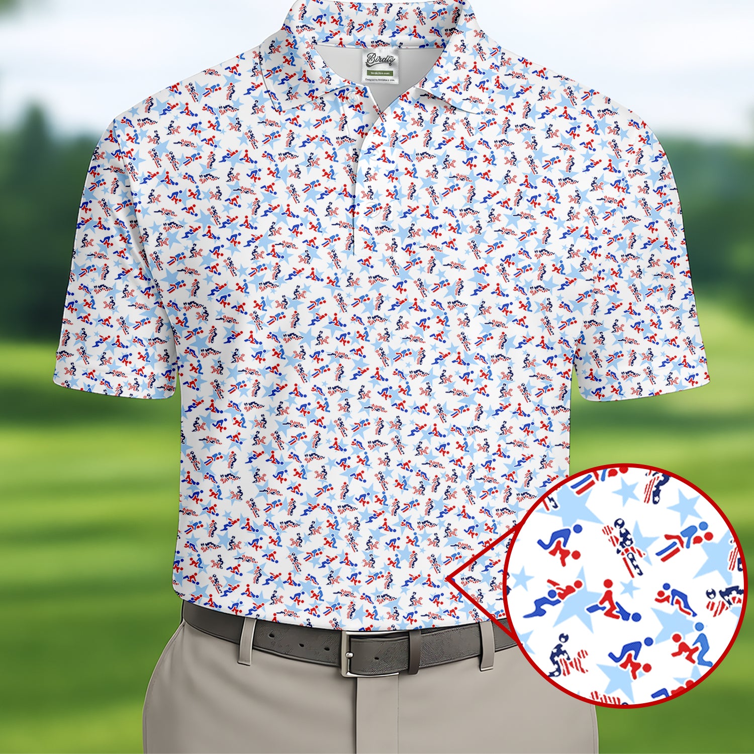 Funny Stick Figure Naughty Couple Red White Blue Polo Shirts For Men, 250th Anniversary Golf Shirts For Men