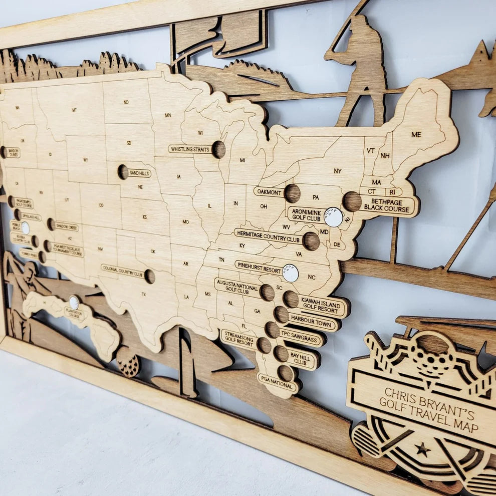Perfect for golf enthusiasts and travelers alike, it’s an artistic way to display the courses you’ve played and the ones still on your bucket list.