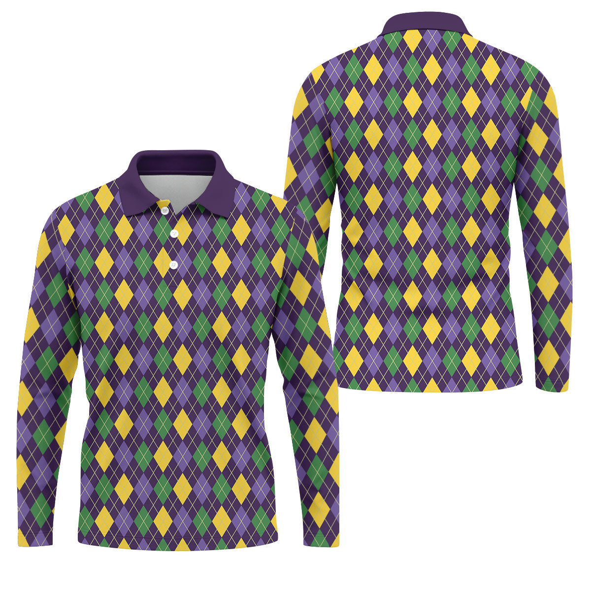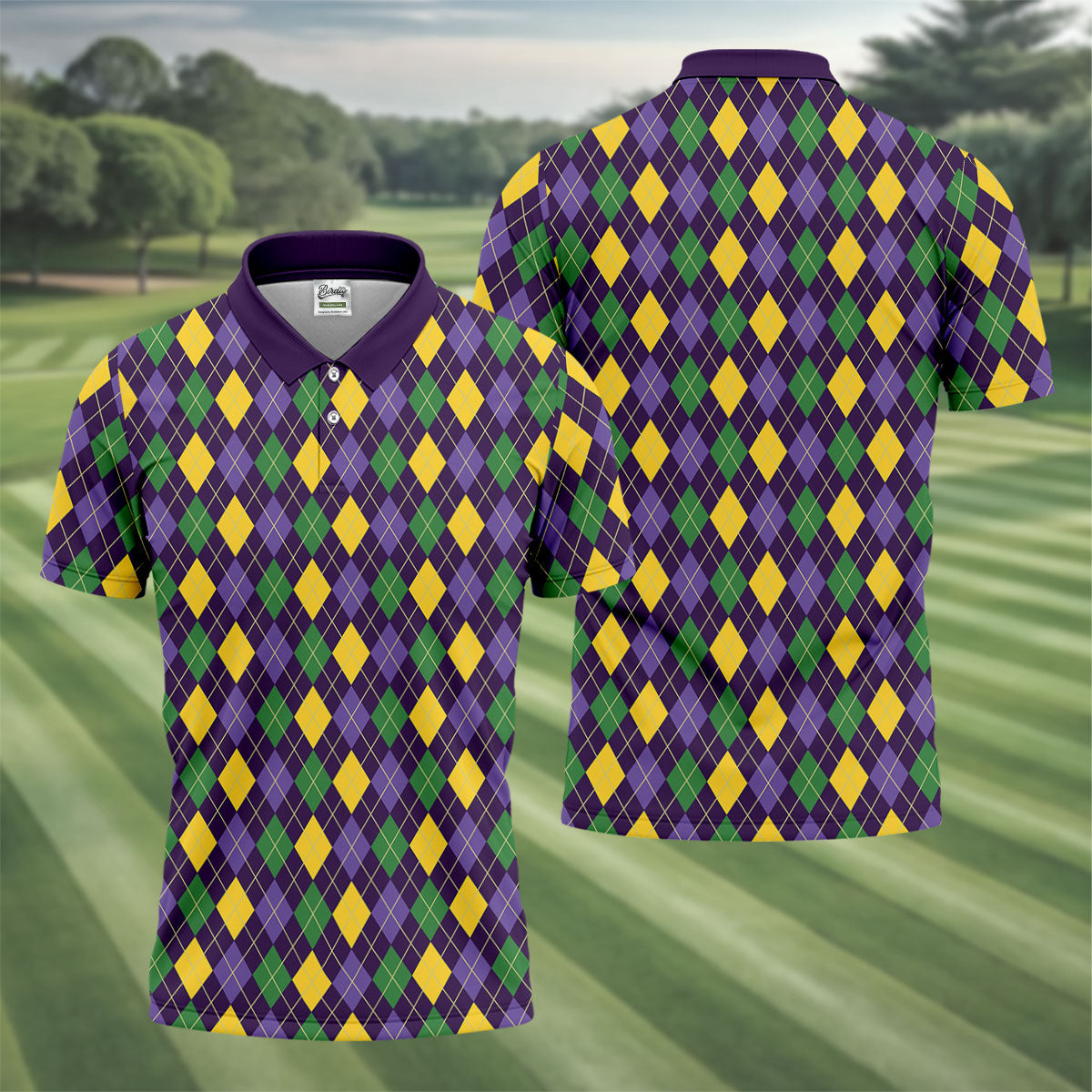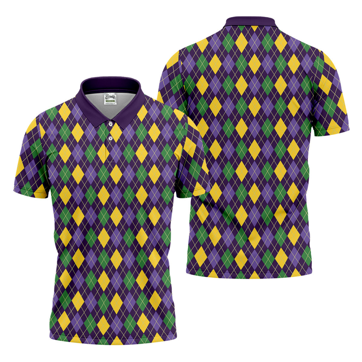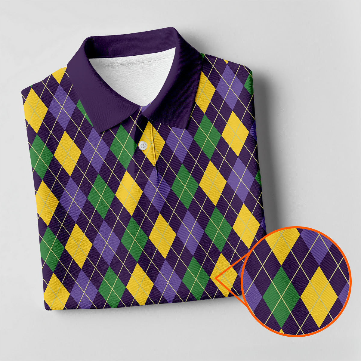 Green Purple Gold Argyle Pattern Mardi Gras Golf Shirt, Polo Shirts For Men, Golf Shirts For Men