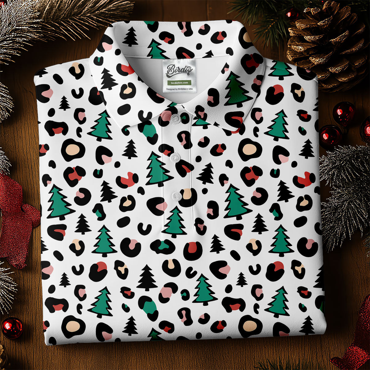 Leopard Pattern Xmas Pine Tree Golf Tops For Men, Christmas Golf Shirt, Cute Golf Outfit, Polo Shirts For Men