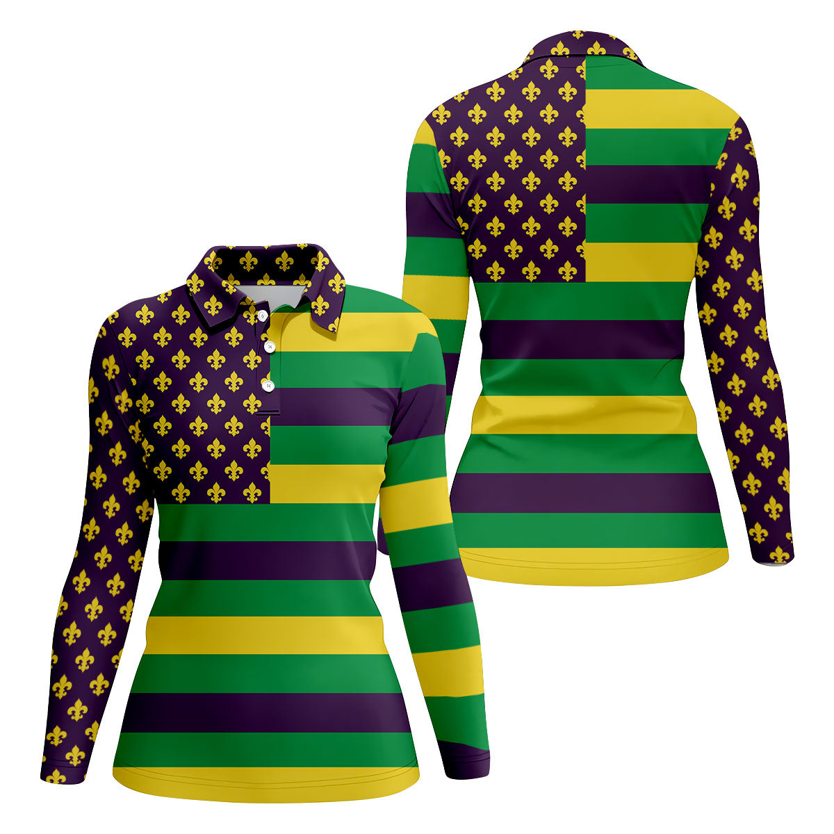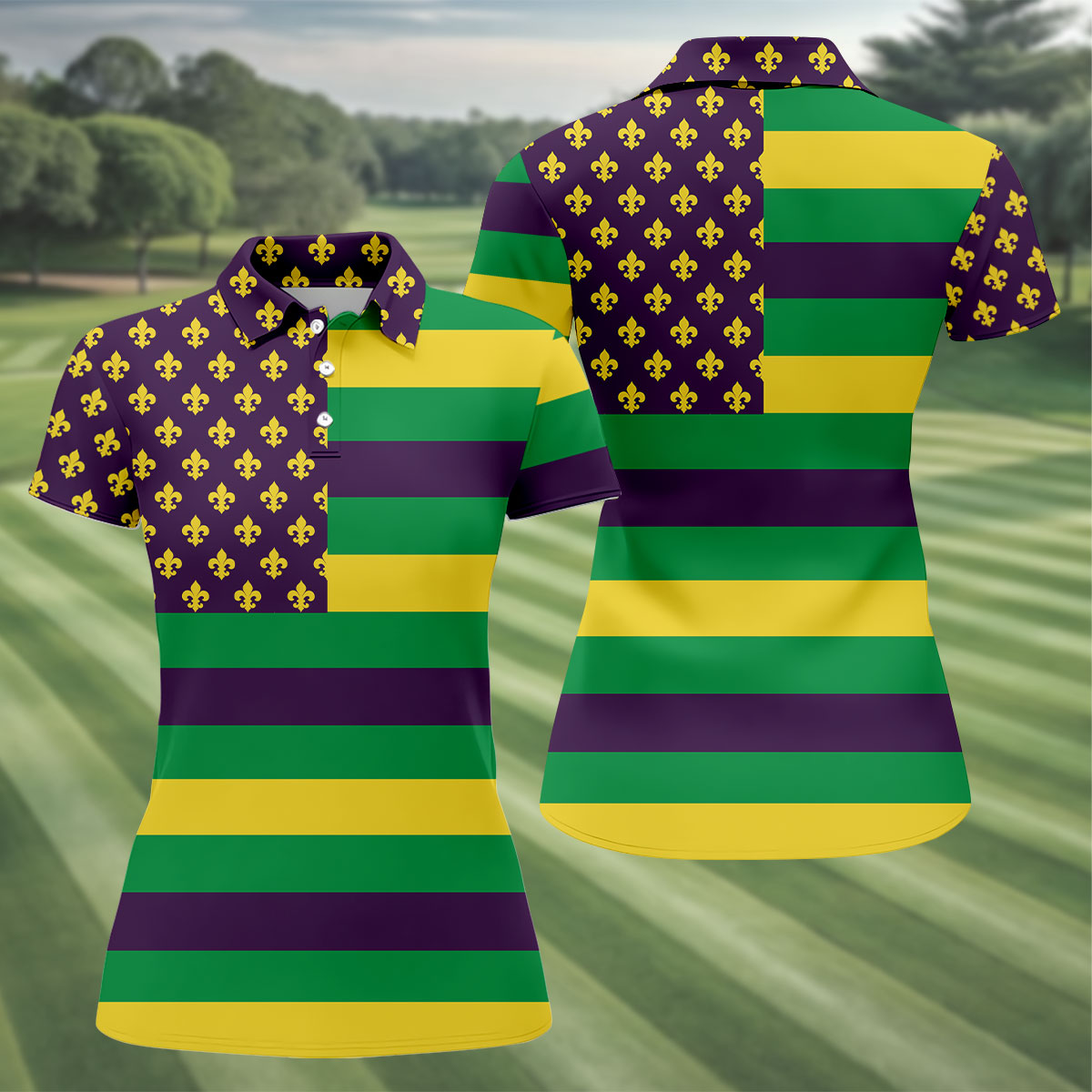 Mardi Gras Flags Fleur De Lis Purple Green Gold Ladies Golf Tops, Women's Golf Tops, Ladies Golf Polos