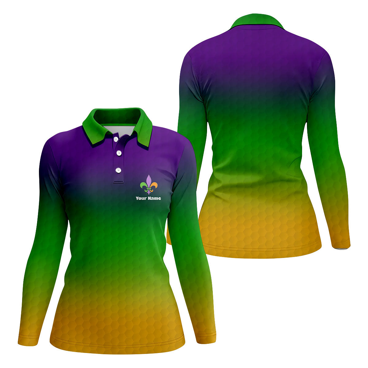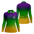 Mardi Gras Purple Gold Green Blended Color Golf Ball Pattern Women's Golf Tops, Women's Golf Shirts, Ladies Golf Polos