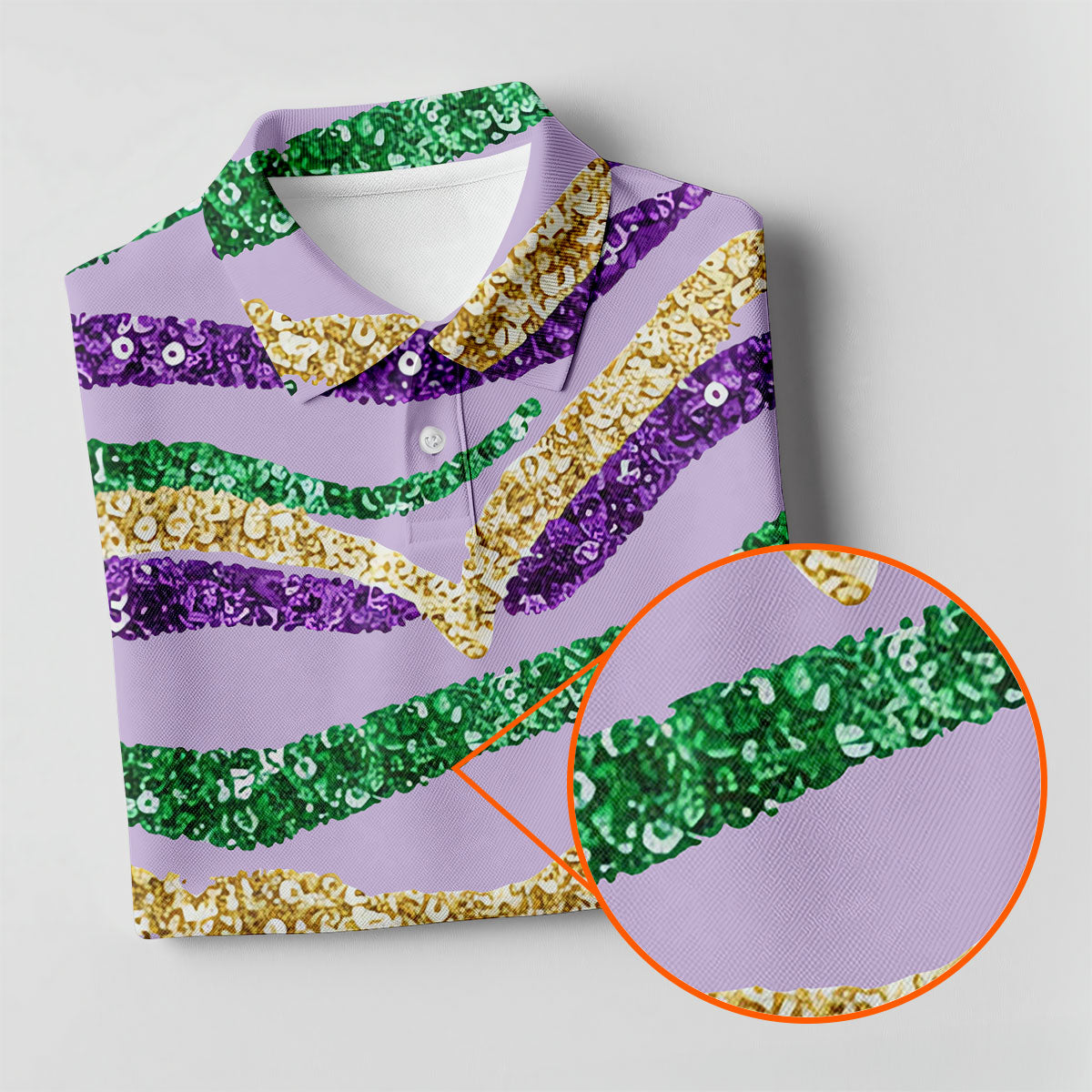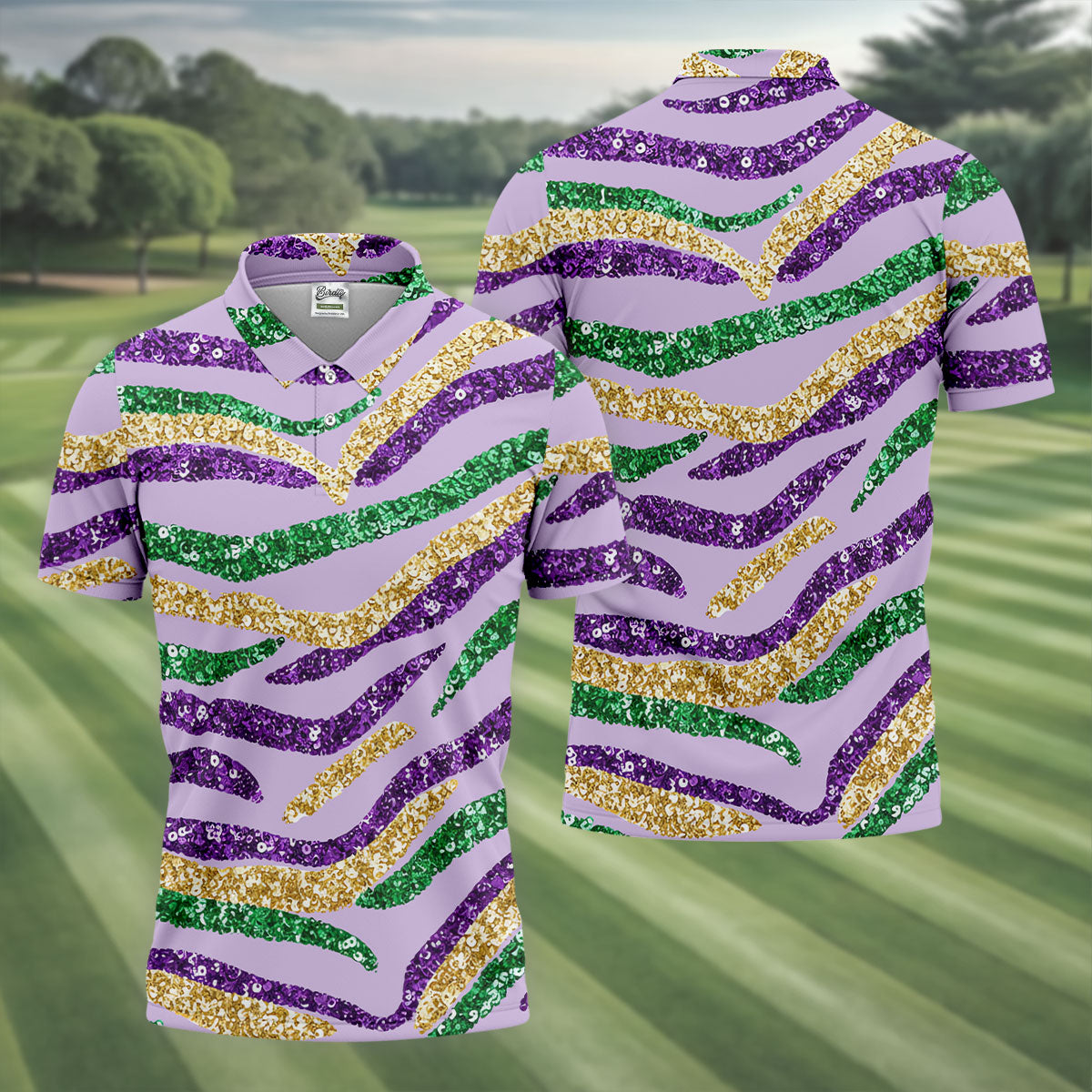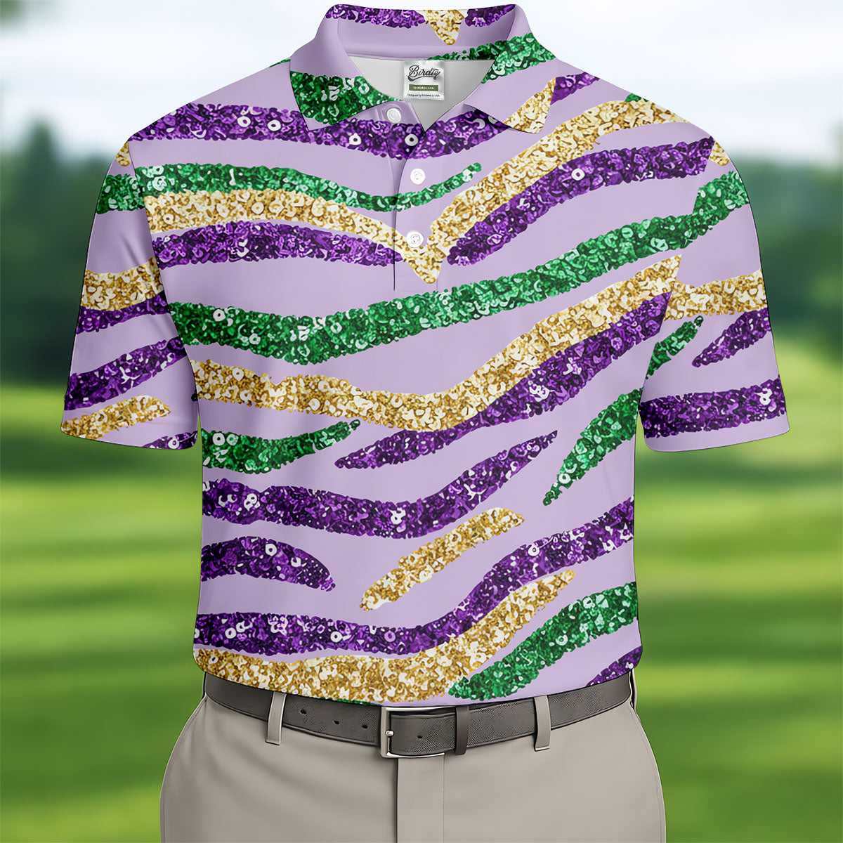 Purple Green Gold Sequin Pattern Light Purple Mardi Gras Golf Shirt, Polo Shirts For Men, Golf Shirts For Men