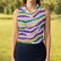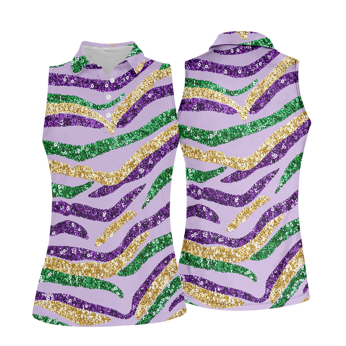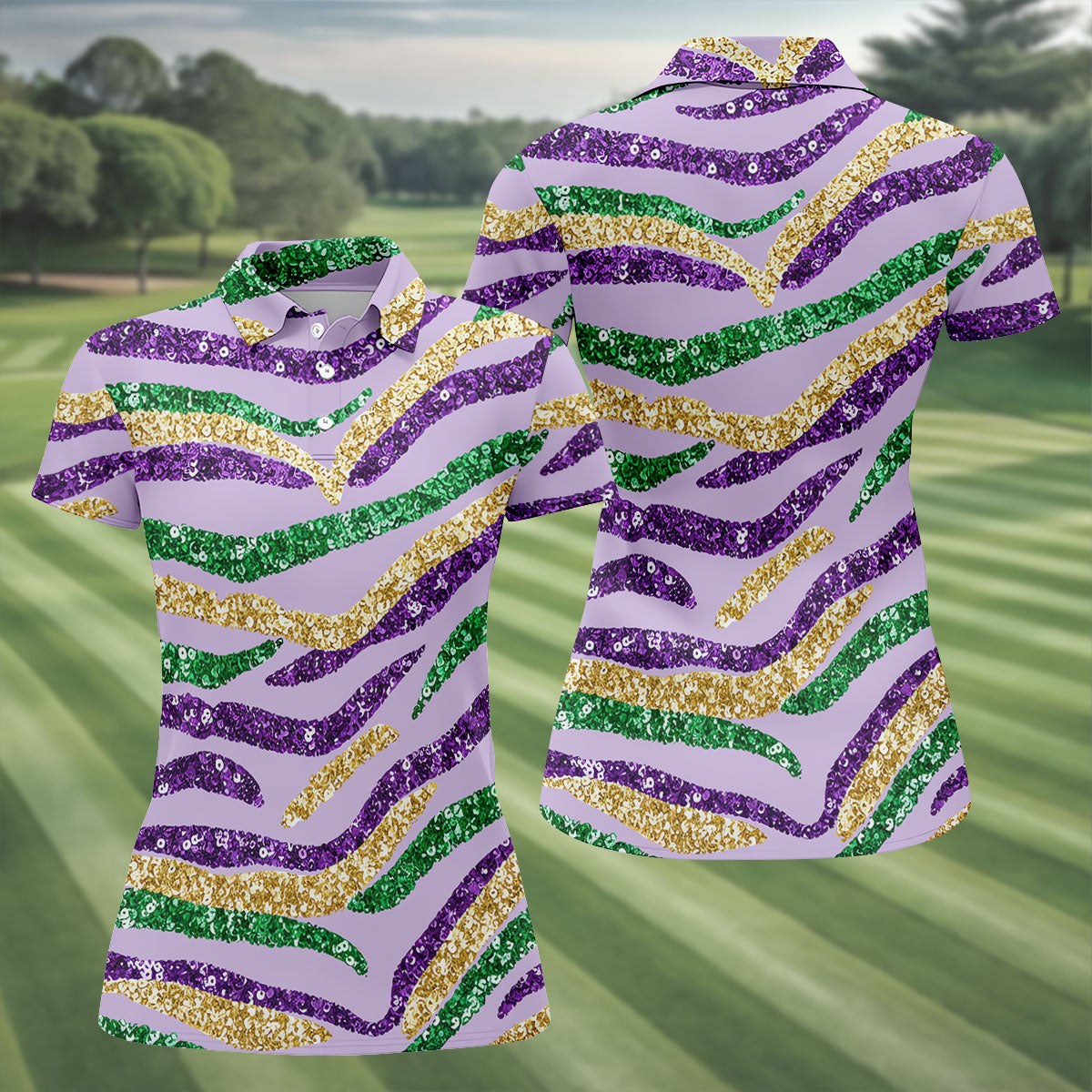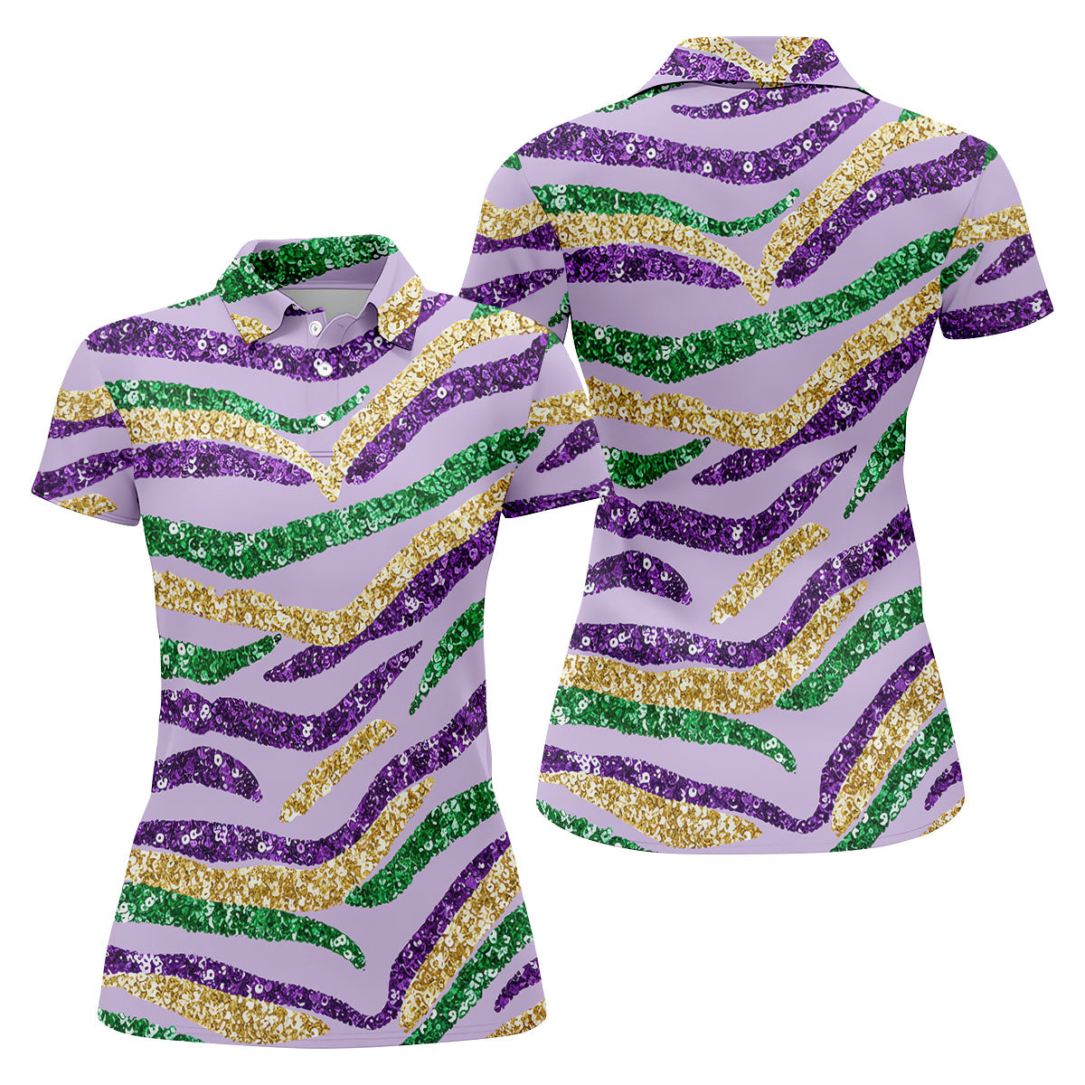 Purple Green Gold Sequin Pattern Light Purple Mardi Gras Golf Shirt, Women's Golf Tops, Ladies Golf Shirts