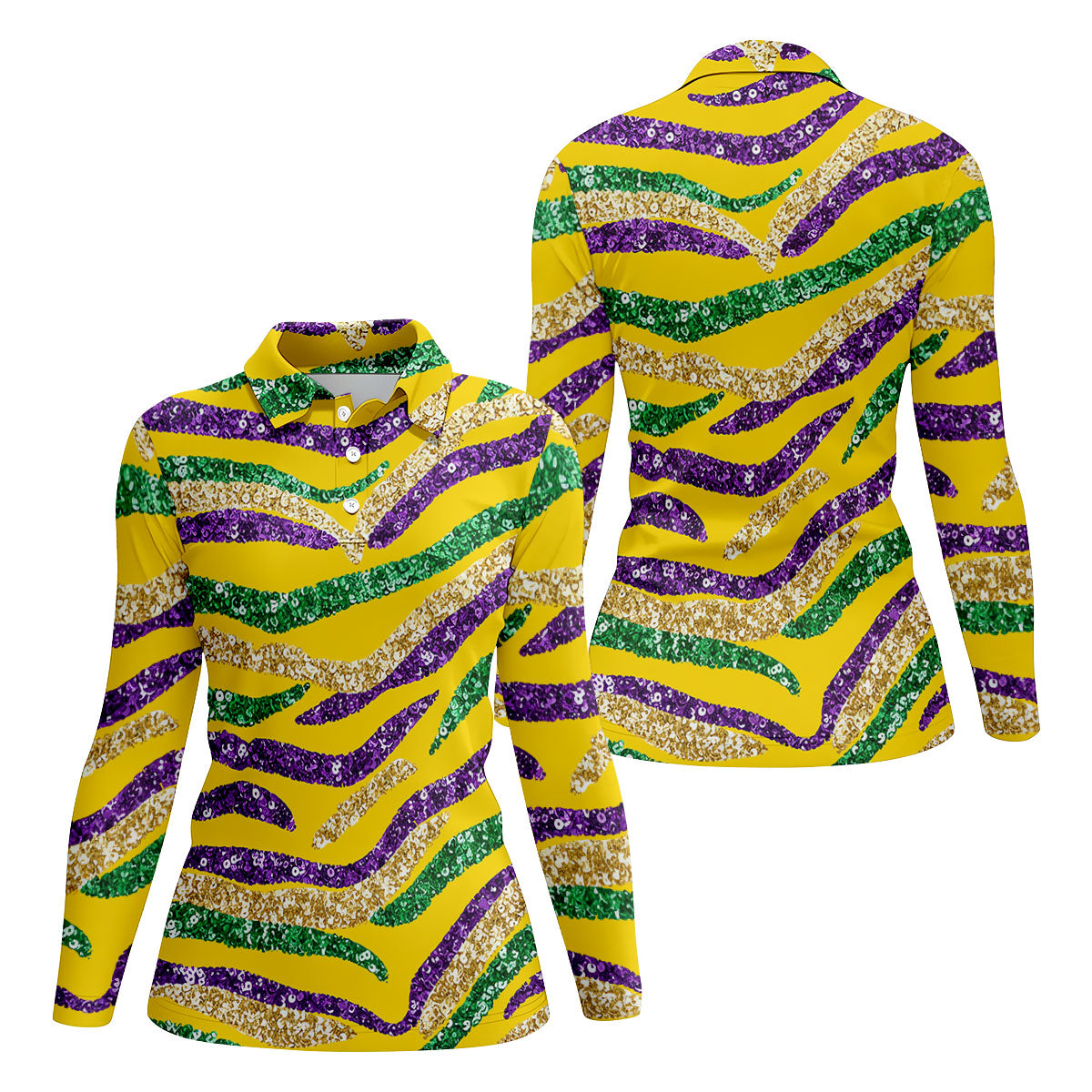 Purple Green Gold Sequin Pattern Yellow Golf Shirt, Mardi Gras Golf Shirt, Women's Golf Tops, Ladies Golf Shirts