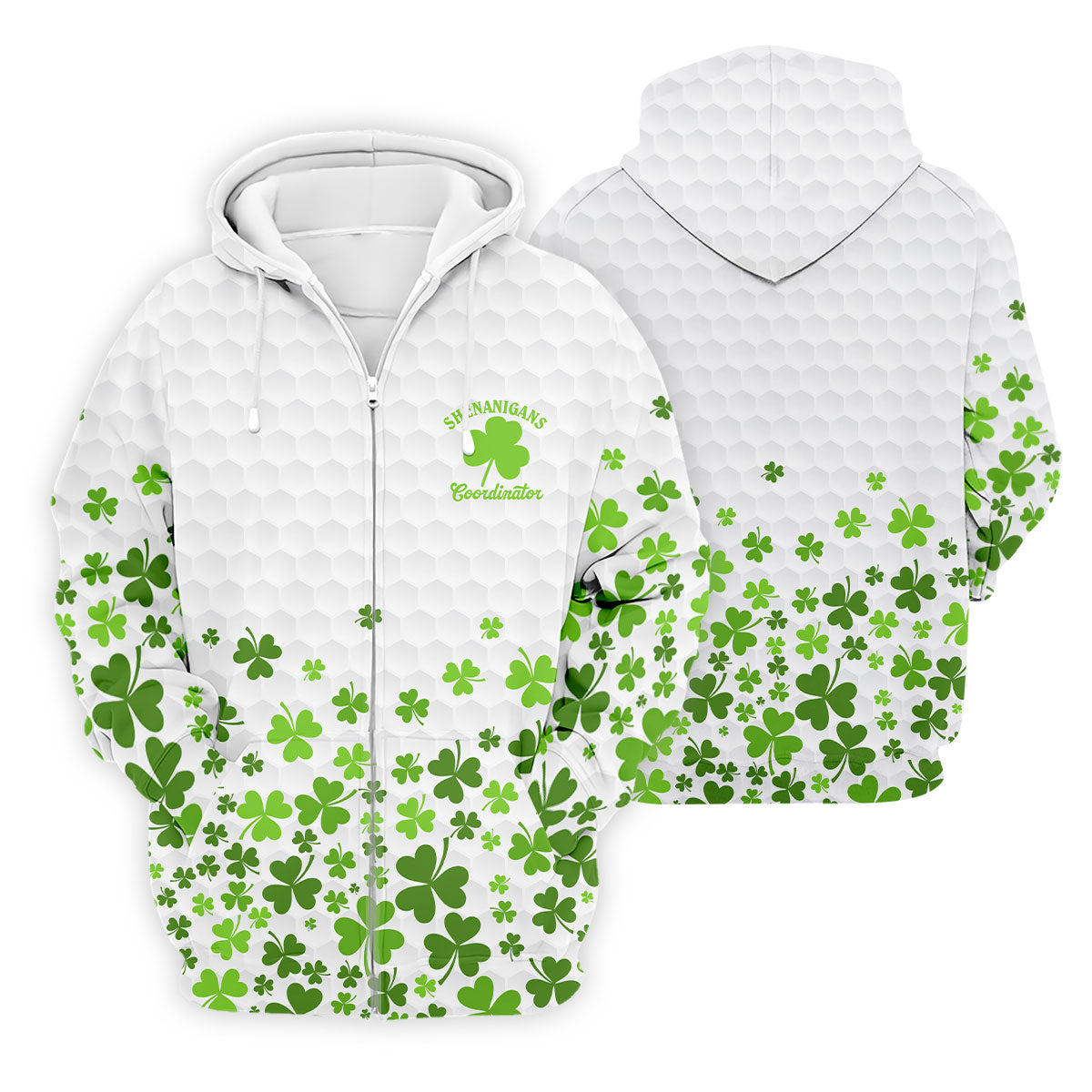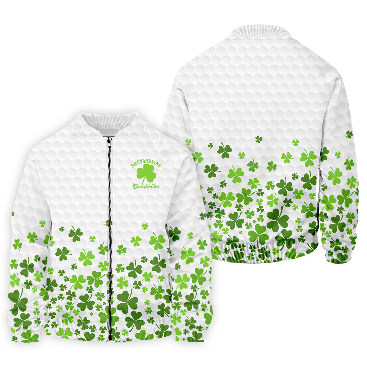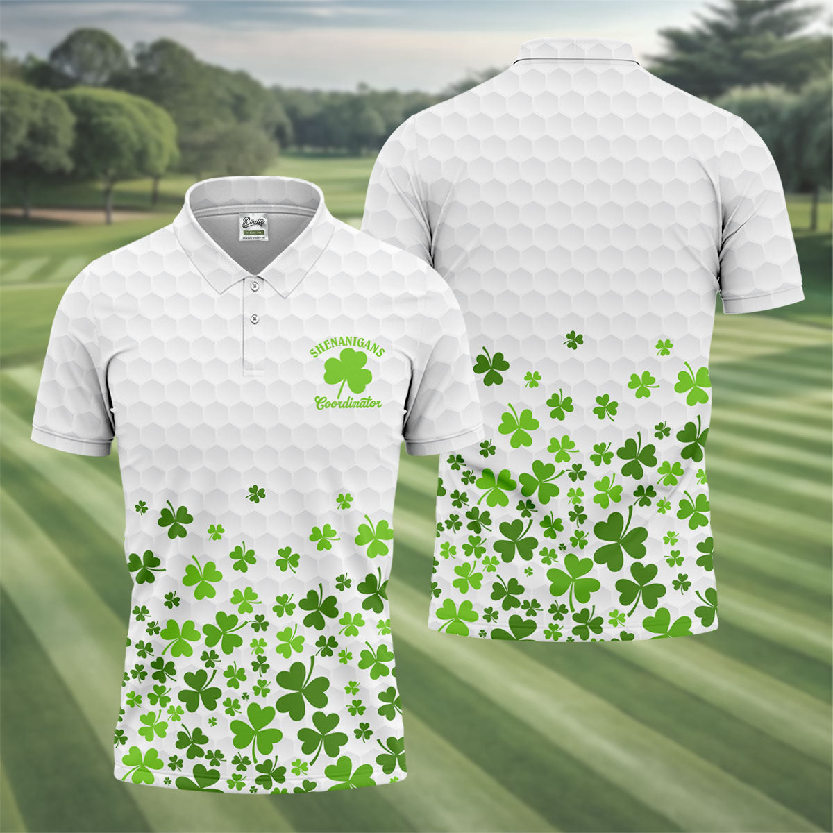 Shenanigans Coordinator Golf Ball Pattern St Patrick Day White Golf Shirt, Golf Tops For Men, Golf Shirts For Men