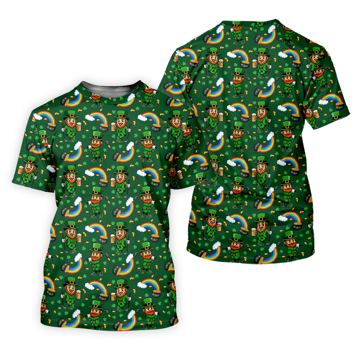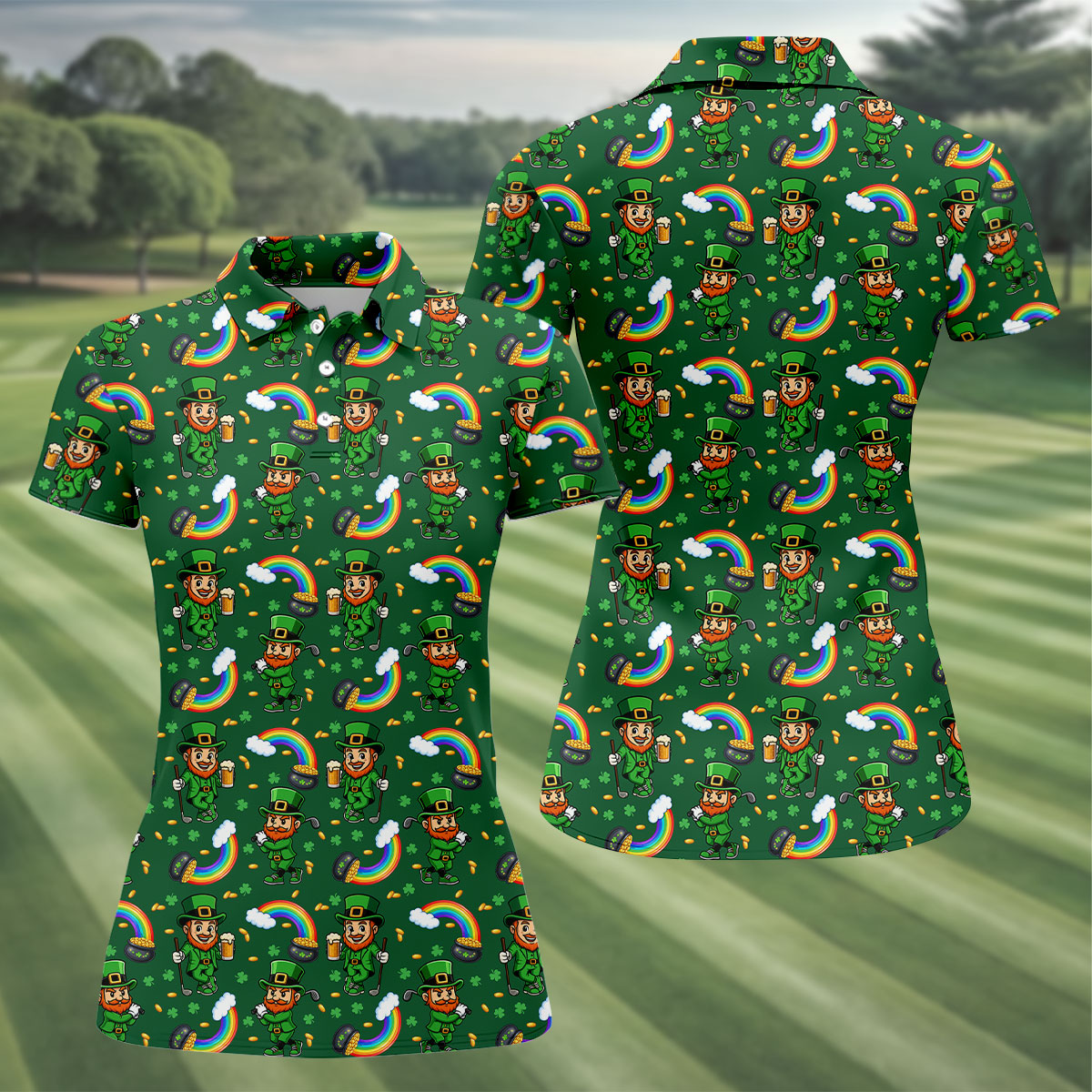 St Patrick's Day Leprechaun Golf Pose Rainbow Gold Pot Shamrock Golf Shirt, Women's Golf Shirts, Ladies Golf Polos