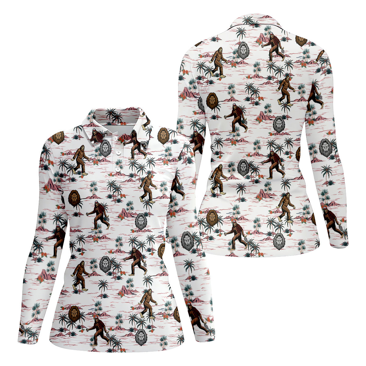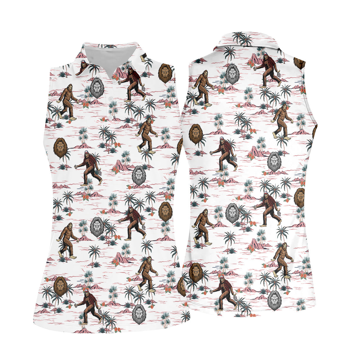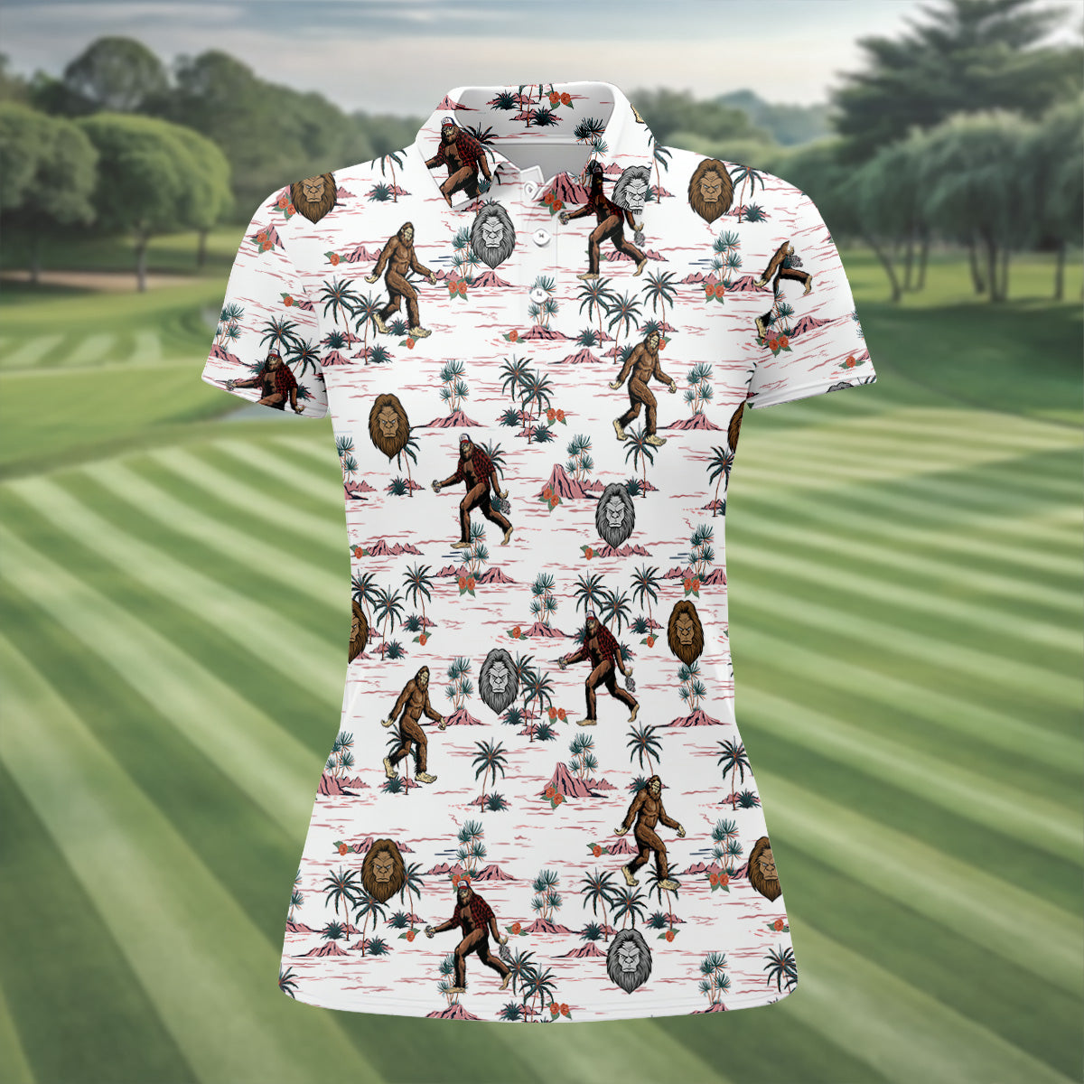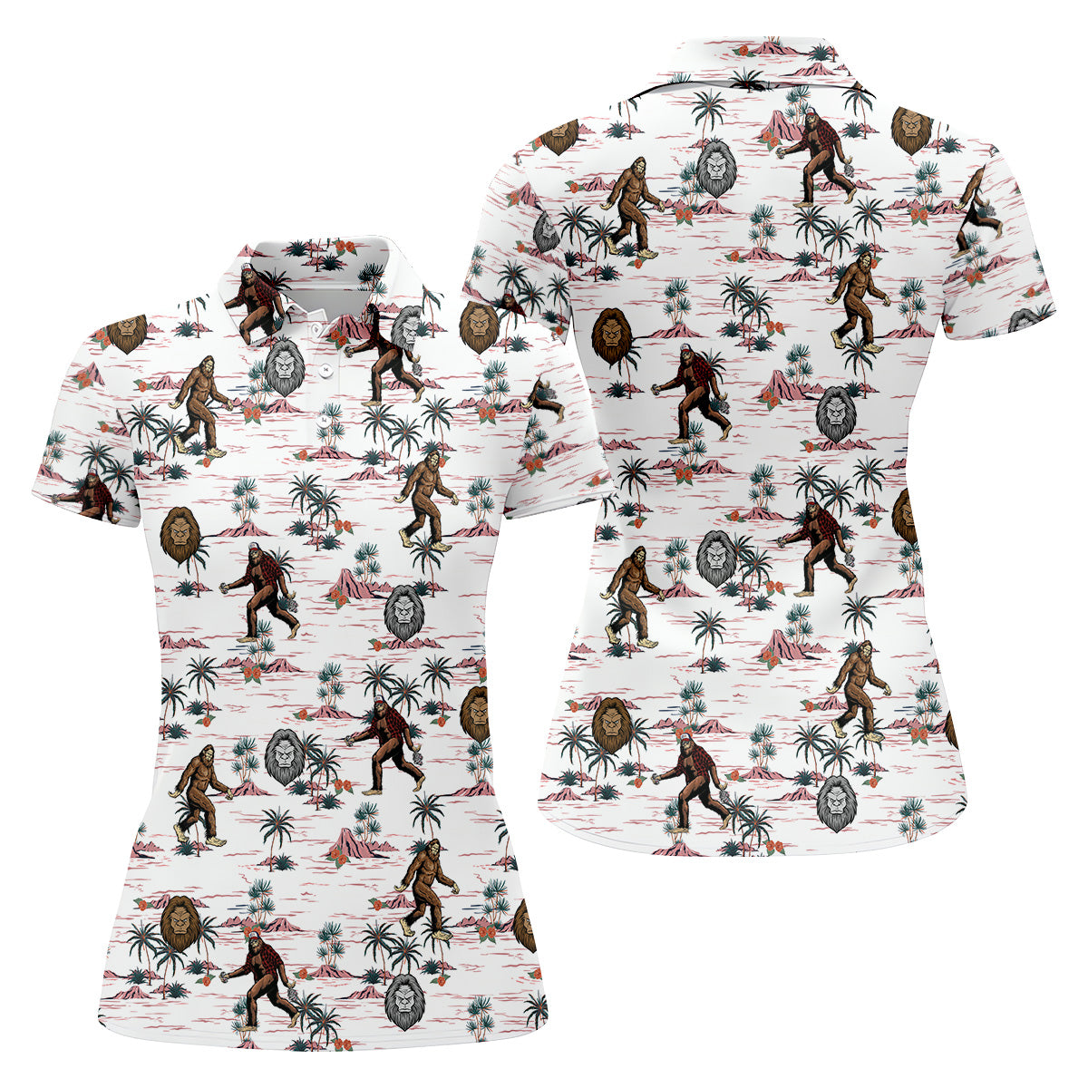 White Funny Sasquatch Tropical Golf Shirts, Funny Golf Shirts Women, Ladies Golf Shirts, Golfing Apparel