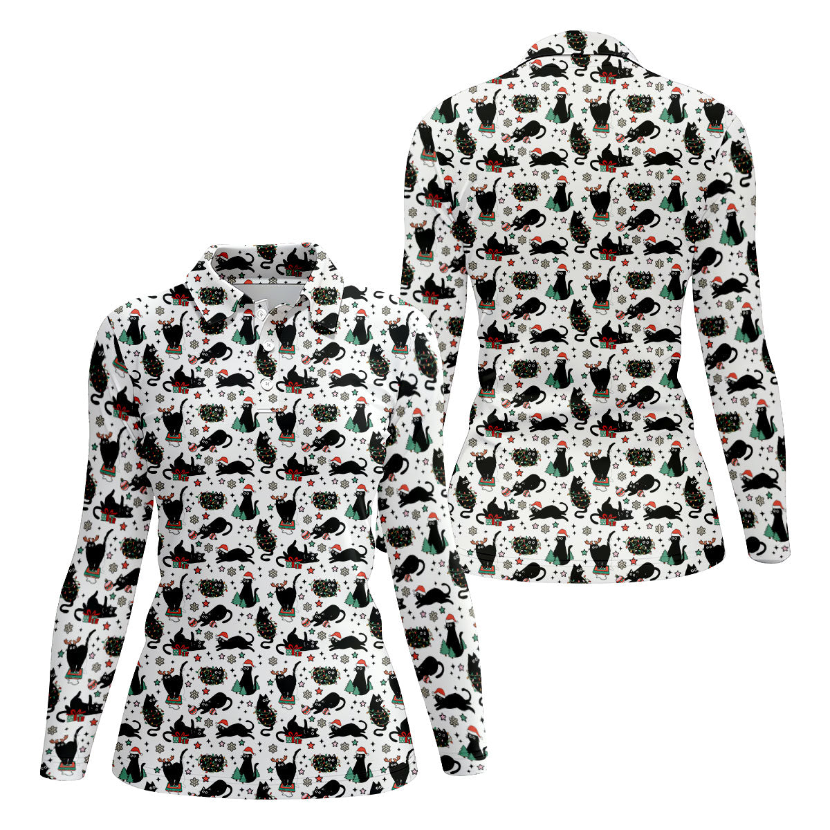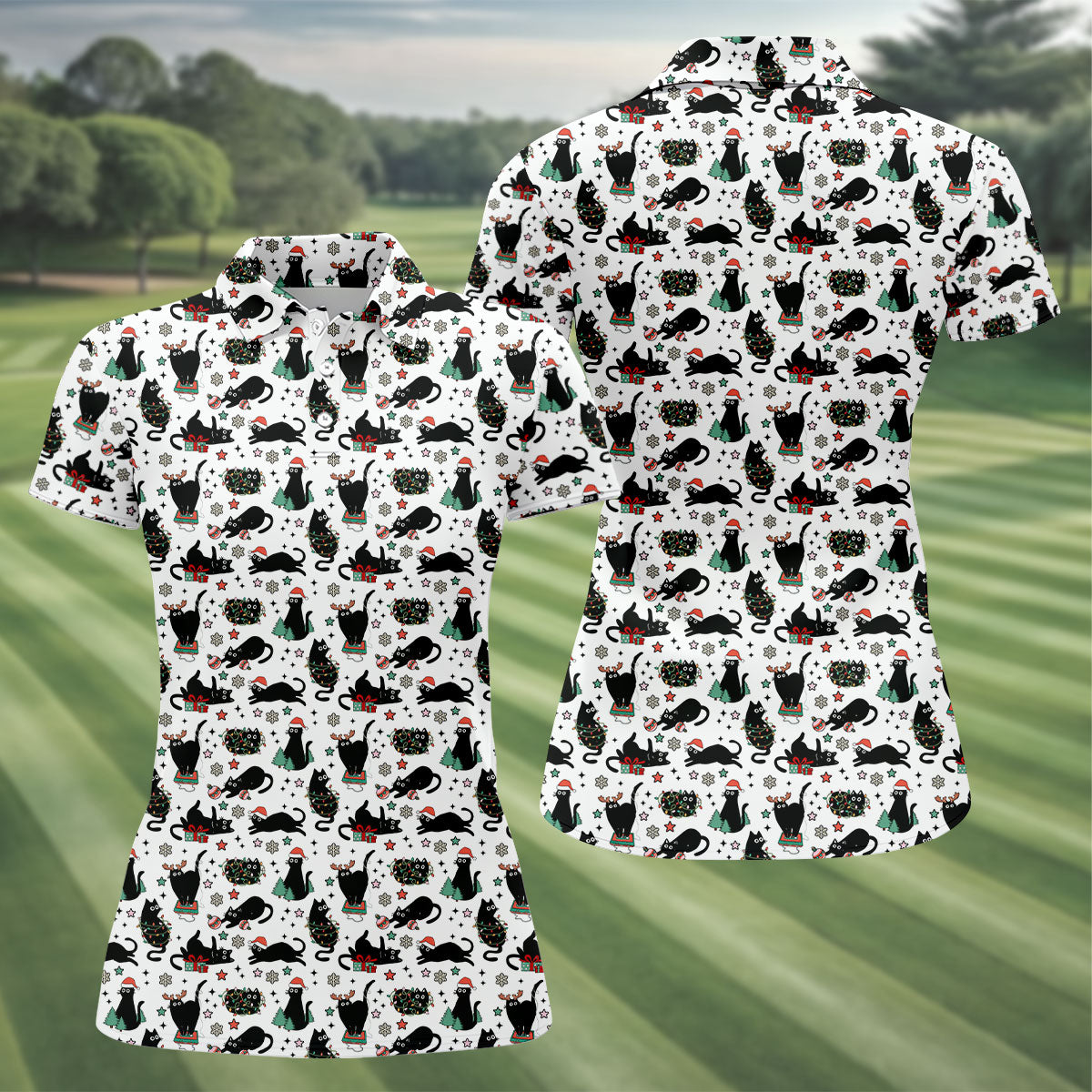 Xmas Black Cat Women's Golf Shirts, Ladies Golf Tops, Golf Gifts For Women, Christmas Golf Shirt